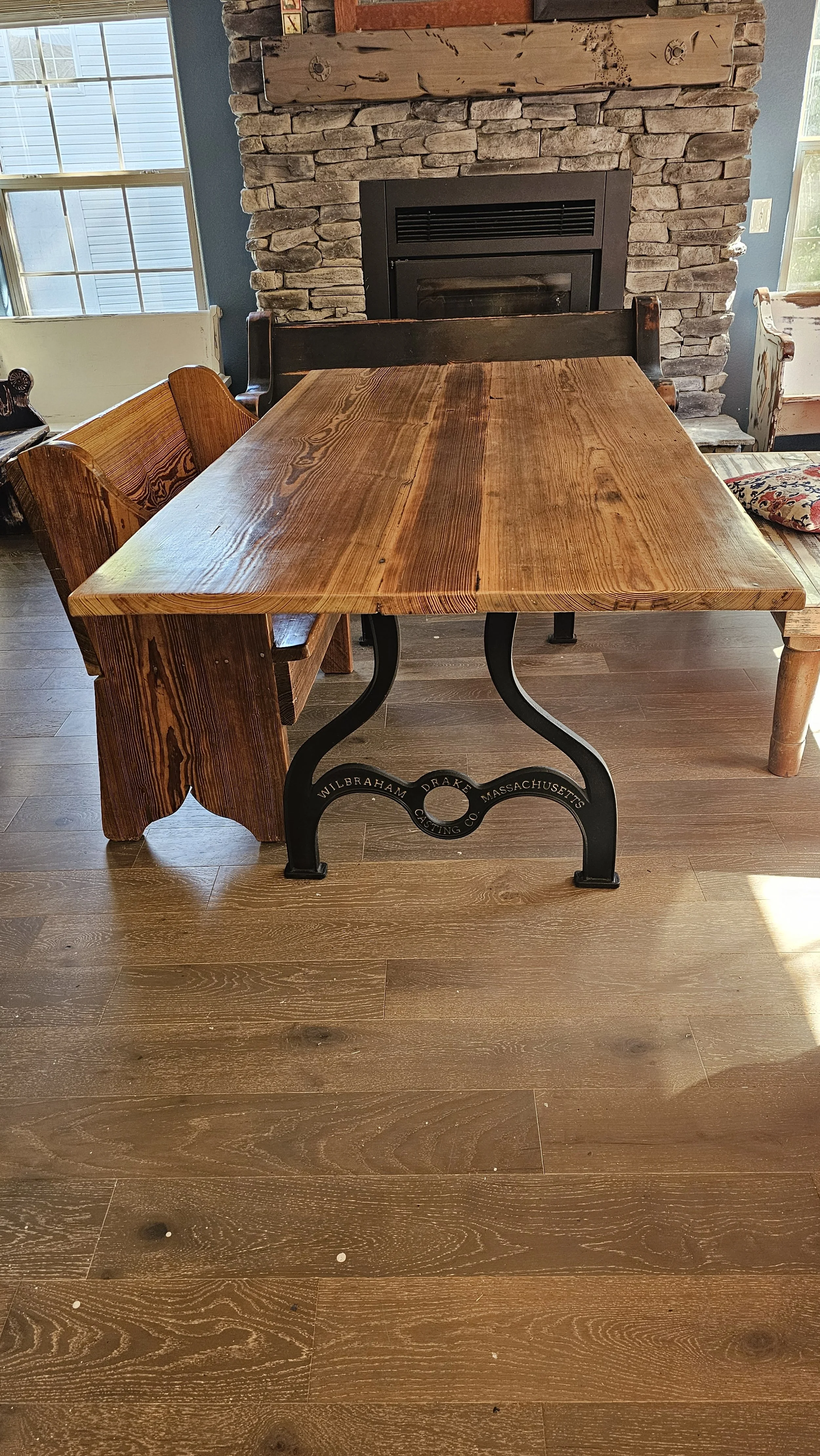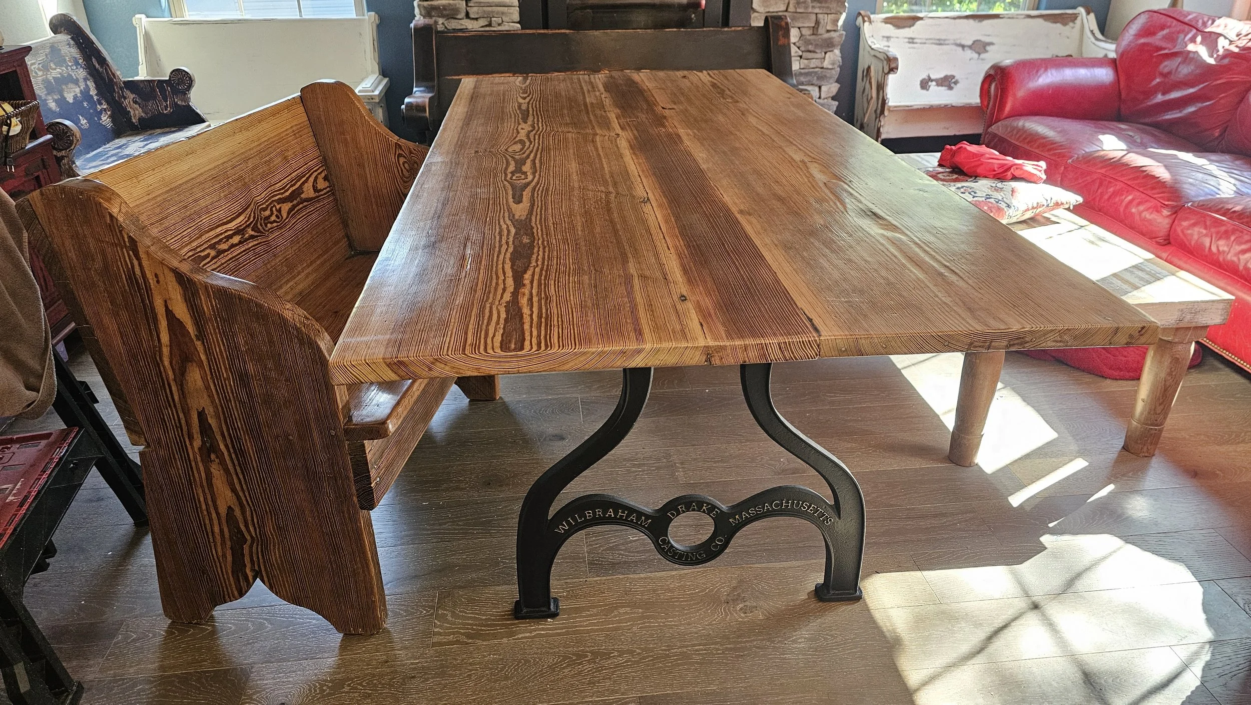 $4499-This bench & table combo are built from an 1800s pew obtained in Texas. The table is supported by cast iron legs resembling those of the Industrial Era (check the Drake Casting Co. For how these 108lbs legs can support over 5000lbs)